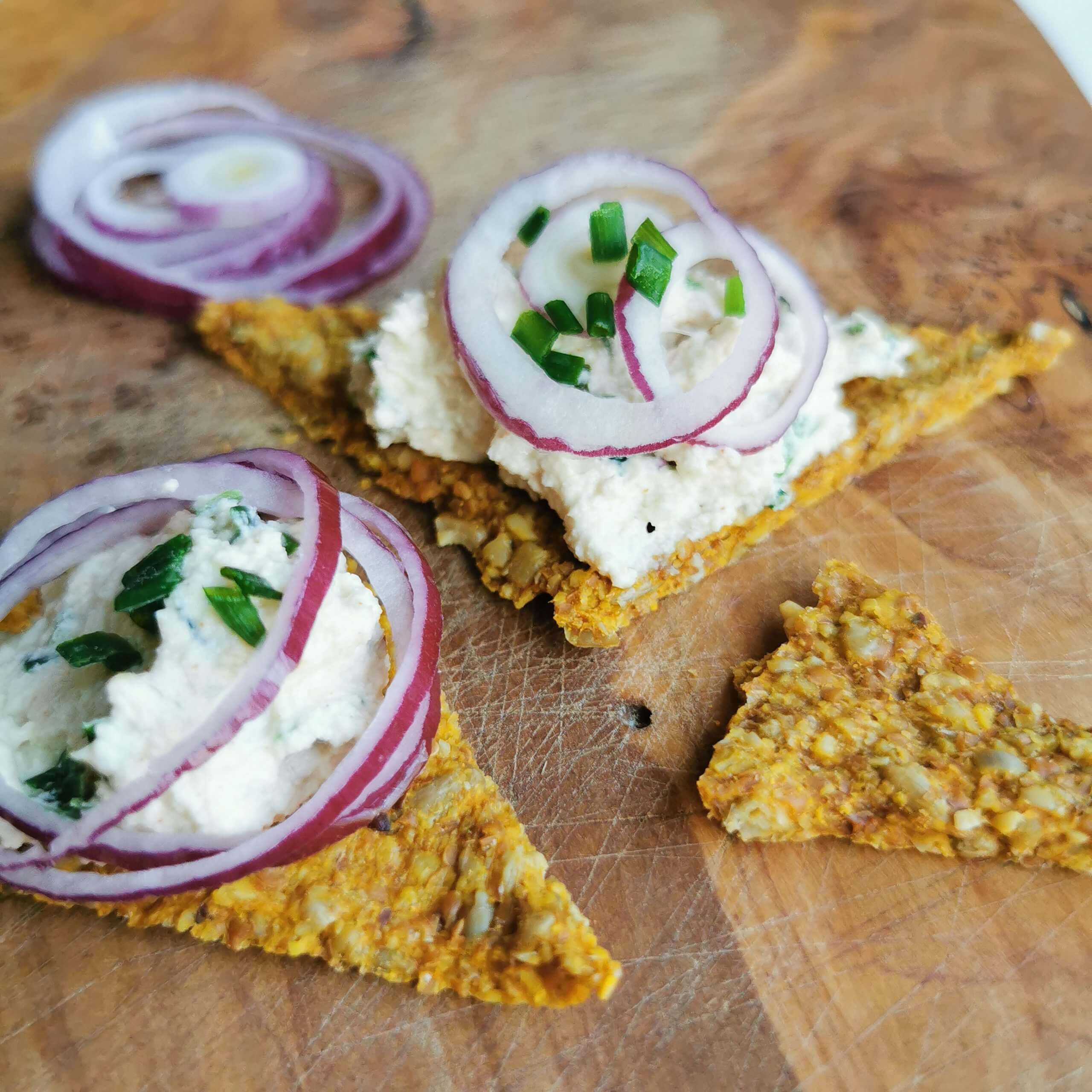 - Die Creme mit Lauchzwiebel oder anderen Kräutern nach Wunsch garnieren und genießen. Passt super zu Rohkost-Kräckern oder als Finderfood auf Zucchini-Scheiben. Lecker!