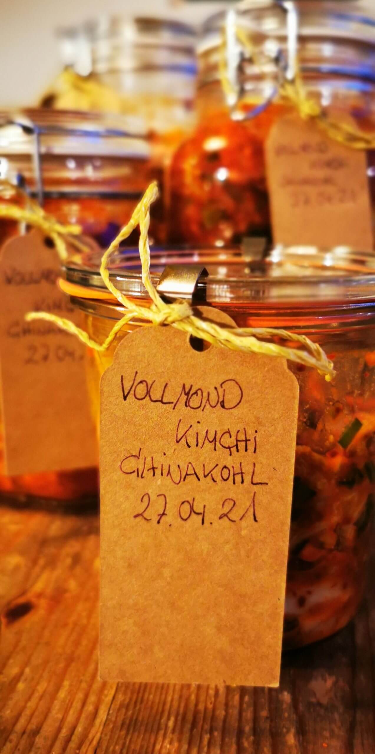- Aufkleber oder Anhänger mit Inhalt des Glases und Datum beschriften. Und am Kimchi-Glas anbringen. Wir machen meist mehrere Varianten. Dabei ist es hilfreich wenn man noch weiß, was genau in welchem Glas ist.