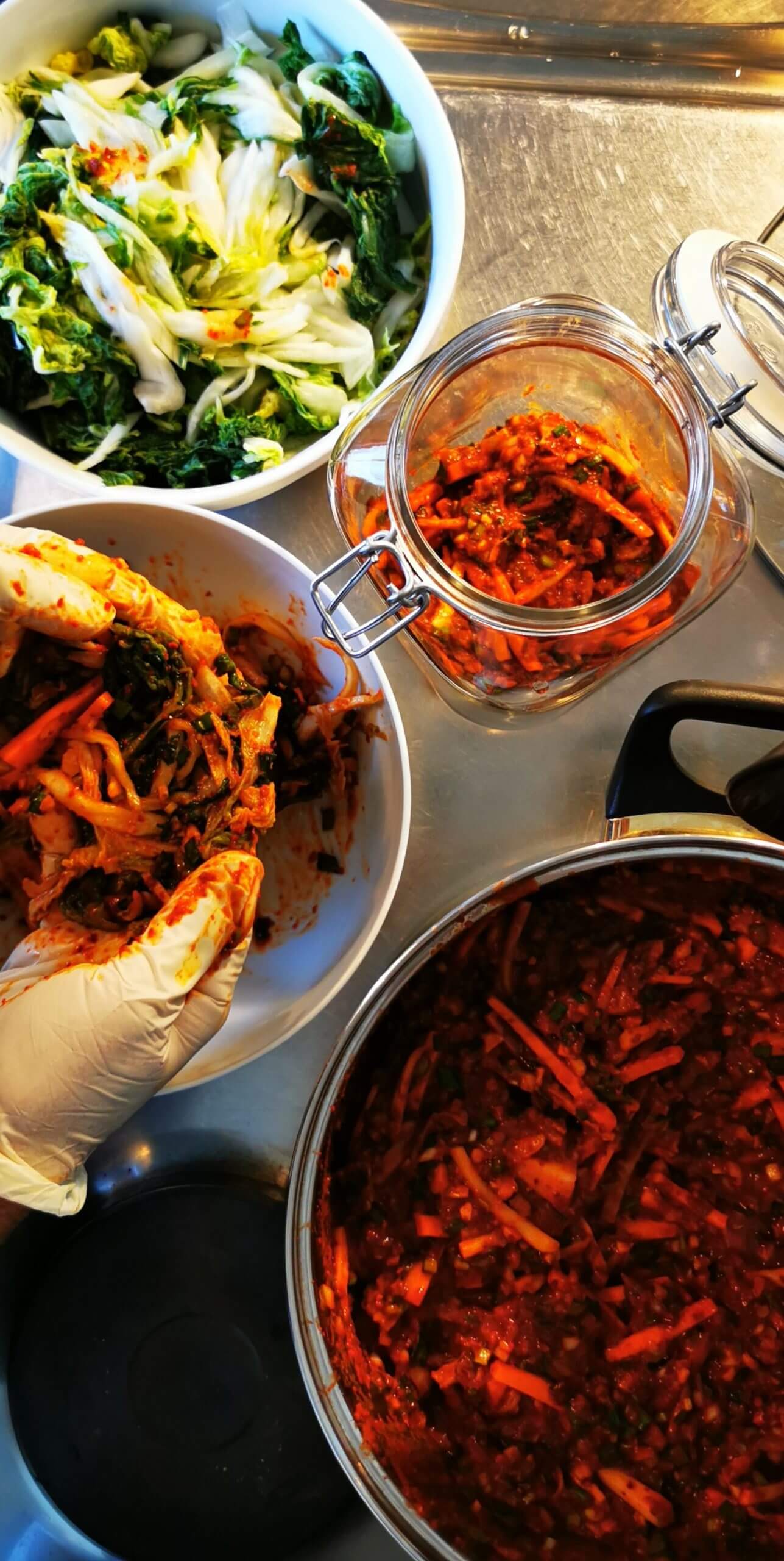 Zu den Mengenangaben: Da auch die Chinakohl-Größe immer stark variieren kann, passen auch wir unsere Mengen – und auch je nach Verfügbarkeit – an. Wir rechnen die Mengen entsprechend hoch oder runter. So kann es sein, dass einmal mehr Rettich oder mal mehr Karotte dazukommen. Manchmal gibt es keinen Buchu und auch keinen “normalen” Schnittlauch. Dann nehmen wir vielleicht etwas mehr Frühlingszwiebel. Manchmal verarbeiten wir 5 kg Chinakohl, manchmal nur einen einzelnen.